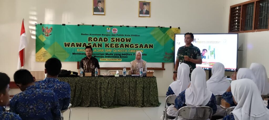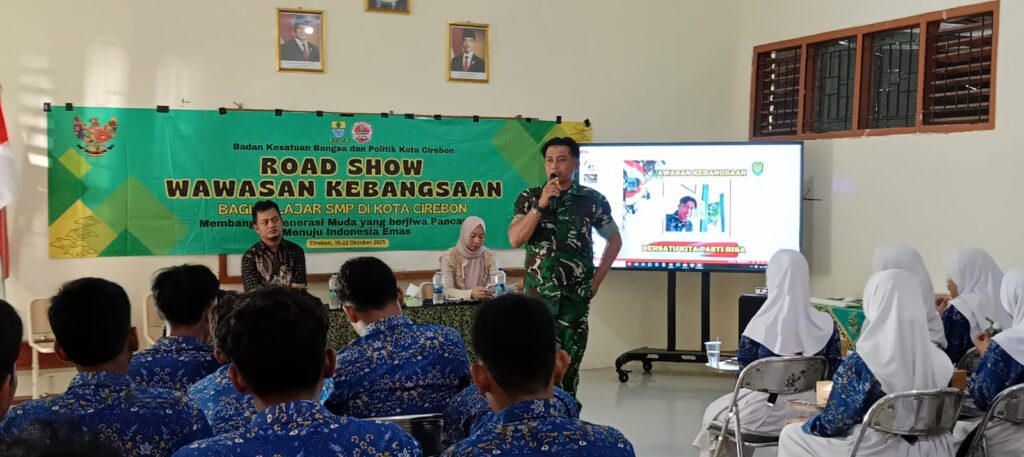 Kota Cirebon, (Kamis, 16/10/2025), – Dalam rangka menumbuhkan semangat nasionalisme di kalangan pelajar, Danramil 0614-03/Lemahwungkuk, Kapten Inf Karyono memberikan pembekalan Wawasan Kebangsaan kepada siswa dan siswi SMPN 8 Kota Cirebon. Kegiatan ini mengusung tema “Membangun Generasi Muda yang Berjiwa Pancasila Menuju Indonesia Emas”, yang dilaksanakan bekerja sama dengan Badan Kesatuan Bangsa dan Politik (Bakesbangpol) Kota Cirebon melalui program Road Show Wawasan Kebangsaan bagi pelajar tingkat SMP se-Kota Cirebon.