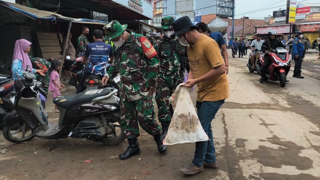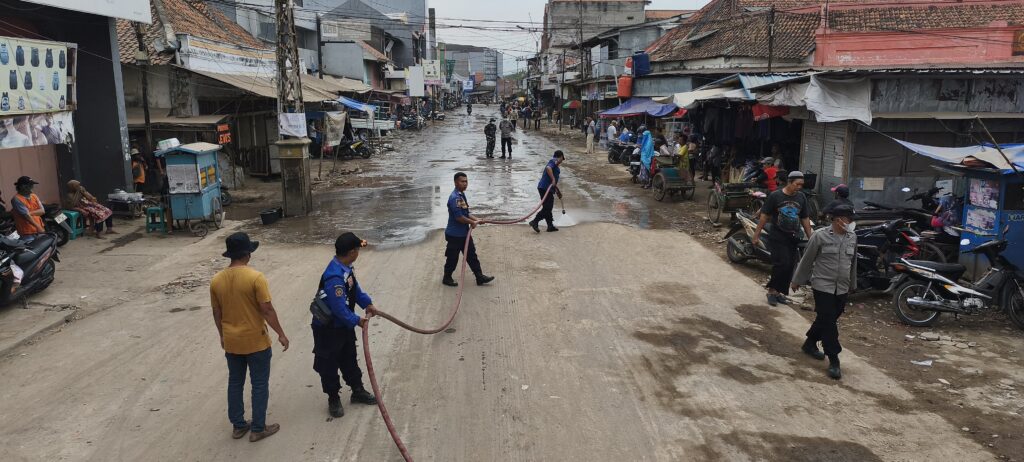 Puluhan personel TNI, Polri, Dinas Pemadam Kebakaran, Satpol-PP, aparatur desa, dan masyarakat bahu-membahu membersihkan tumpukan sampah dan sisa-sisa material pasar darurat serta penyemprotan badan jalan dari tanah dan debu. Aksi ini bertujuan mengembalikan fungsi jalan sebagai jalur lalu lintas masyarakat dan menciptakan lingkungan yang bersih serta sehat.