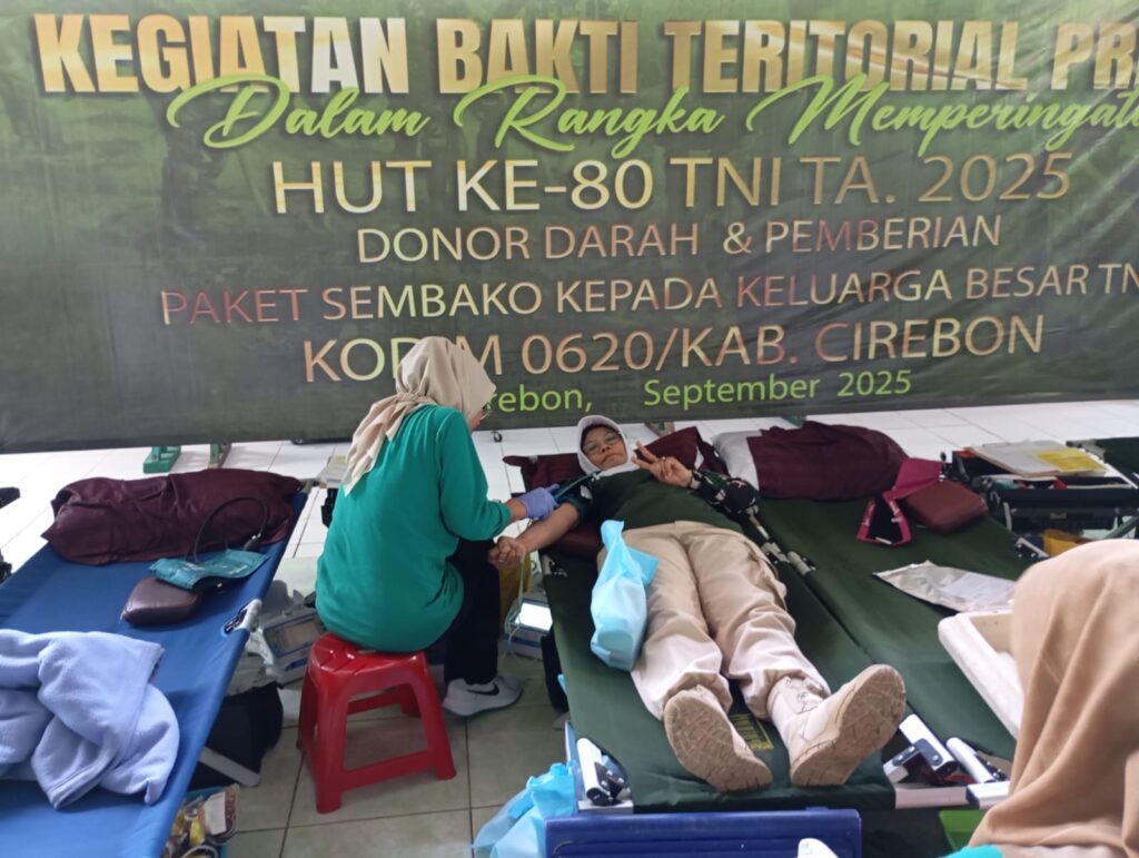 Cirebon, 12 September 2025 – Rangkaian kegiatan dalam rangka memperingati Hari Ulang Tahun Tentara Nasional Indonesia (HUT TNI) ke-80, Kodim 0620/Kabupaten Cirebon melaksanakan kegiatan Bakti Teritorial berupa donor darah dan pembagian sembako kepada para Purnawirawan, Warakawuri, serta Keluarga Besar Tentara (KBT), bertempat di Aula Pandawa Makodim 0620/Kab. Cirebon.